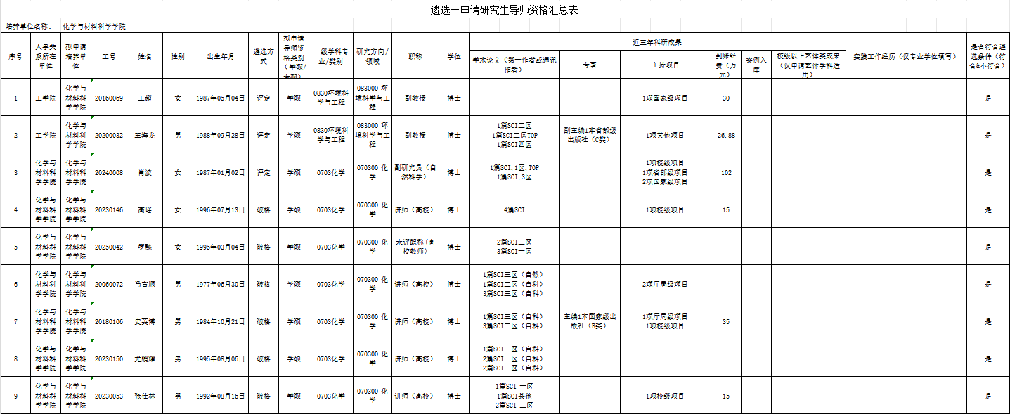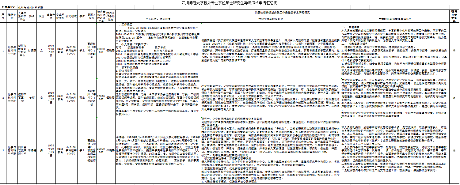 根据四川师范大学研究生院《2025年校内研究生导师遴选通知》及《关于做好2025年校外专业学位硕士研究生导师资格遴选及考核续聘工作的通知》,经申请人申请,学院专人对申请人的申请材料的真实性、学科相关性及是否符合遴选条件进行审核,现将材料审核通过名单公示如下: