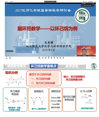 我院史英博教师作《脂环烃教学——以环己烷为例》专题报告,全面展示了学院有机化学课程建设成果,重点介绍了针对化学拔尖人才培养的有机化学教学创新与实践。报告从知识体系建构视角出发,深入剖析环己烷教学的重难点,运用分子模型、微课、案例分析等多元化教学方法确保教学质量,并着重阐述了环己烷教学内容与后续知识点的内在逻辑关联,提出了“注重知识应用与实践学习”的教学理念。报告获得北京师范大学卢忠林教授、邢国文教授及南开大学渠瑾教授的高度评价。