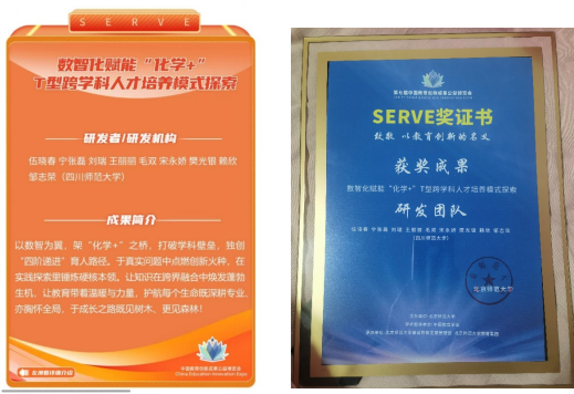 最高奖项SERVE奖经过严格的三轮专业评选和征信调查,由教育界资深专家步步筛选,层层把关,商讨评定,围绕创新成果的教育理念、专业性、可复制性、可推广性等多方面充分讨论,最终仅有21项教育创新成果获SERVE大奖(获奖面1%)。我院《数智化赋能“化学+”T型跨学科人才培养模式探索》成果项目为西南地区高校教育类唯一一项获奖成果。填补了区域在该领域的空白,标志着我院已成为推动西南地区高等教育教学改革的重要引擎和标杆,极大地提升了我院乃至学校的学术影响力与声誉。