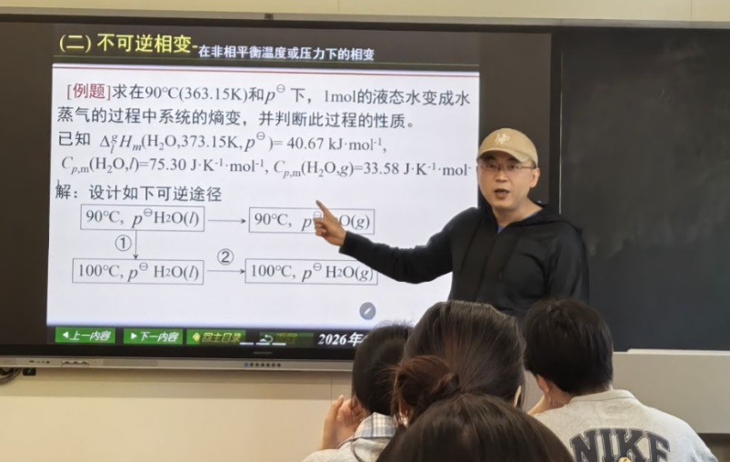 4月8日,在2教308,樊光银老师进行了《物理化学基础——熵变的计算》公开课。樊老师系统讲授单纯状态变化和相变过程的熵变计算,并重点讲解虚拟可逆路径法在不可逆相变过程中的应用。通过单组分系统的状态变化、可逆相变、过冷液体凝固等典型例题,樊老师引导学生掌握“始终设计可逆路径计算状态函数变化”的核心思想,并结合孤立系统熵增原理判断过程自发性。教学督导徐成刚指出本节课讲清了基本原理、讲透了解题方法、讲活了实践应用。课堂讨论过程自发性时,教师引导学生同时计算系统熵变与环境熵变,再判断孤立系统总熵变是否大于零,体现了系统与环境的辩证关系。