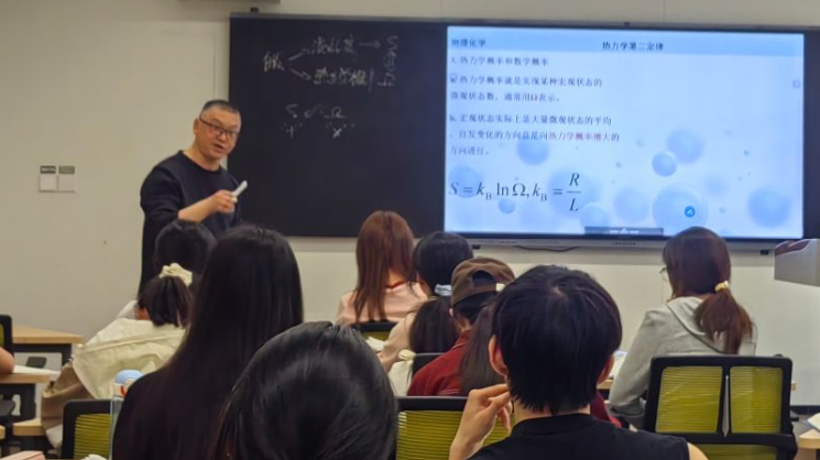 4月10日,在1教204实验室,毛双老师进行了《物理化学1——热力学第二定律的本质与熵的统计意义》公开课。通过热功转换、气体分子的膨胀、书籍的摆放等生动示例,毛老师引出热力学第二定律的本质,并指出熵是系统混乱度的量度,最后结合了玻尔兹曼熵公式的物理意义,实现了宏观热力学与统计物理的自然衔接。教学督导廖杰教授点评道,从热力学第二定律的两种文字描述出发,提出“为什么自然界会有方向性”这一根本问题,然后引入玻尔兹曼的微观解释。这一教学设计体现了科学理论的深化往往需要突破原有认知框架,从现象描述走向本质追问。通过雨课堂推送一道“过程熵变的判断”的选择题,并结合教学内容进行师生互动,体现了“以学生为中心”的教学理念。